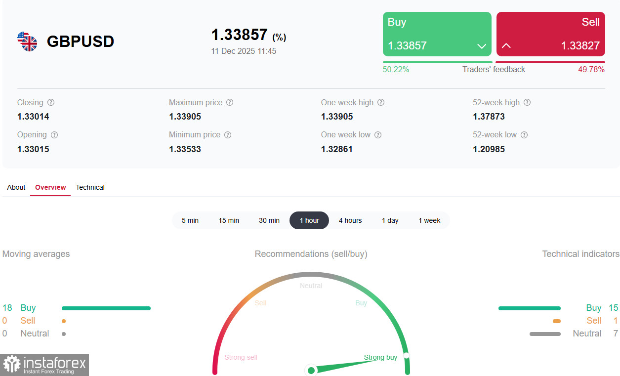 Цена получает поддержку от сильных уровней 1.3300, 1.3255, 1.3215, выше которых преимущественными остаются все же длинные позиции (подробнее - в GBP/USD: сценарии динамики на 11.12.2025).