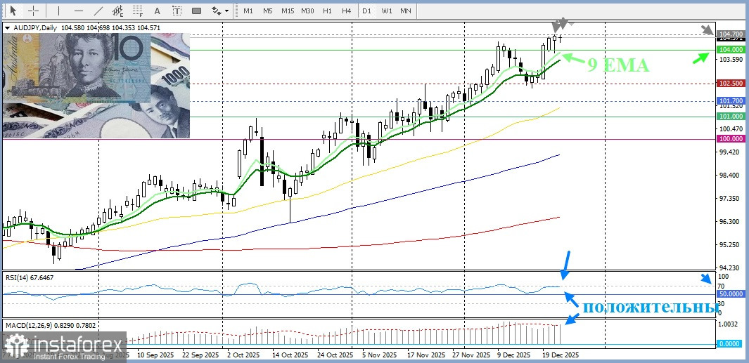 Японская иена получила небольшой краткосрочный импульс после публикации протокола октябрьского заседания Банка Японии, в котором было подчеркнуто широкое согласие о необходимости продолжать повышать ставки, если экономические прогнозы оправдаются. На декабрьском заседании Банк Японии поднял учетную ставку до 0,75%, что является 30-летним максимумом, и оставил открытой возможность для дальнейшего ужесточения денежной политики. В условиях сохраняющейся геополитической неопределенности это укрепляет статус дальневосточной валюты как защитного актива, оказывая некоторое давление на кросс-курс AUD/JPY.