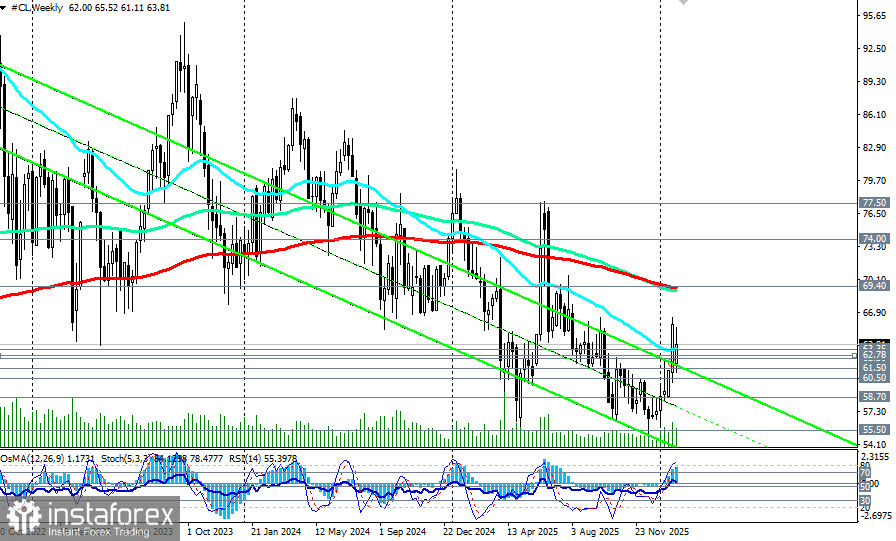При резком обострении ситуации на Ближнем Востоке, неожиданном сокращении запасов или, если ОПЕК+ даст новые сигналы о готовности к более активным действиям по поддержке рынка, возможен сценарий восстановления и роста цен. В этом случае возможен возврат к уровням выше зоны недавних максимумов около 65.00 – 66.00 долларов за баррель с перспективой выхода на долгосрочный бычий рынок, расположенный выше ключевого уровня сопротивления 69.40 (ЕМА200 на недельном графике).