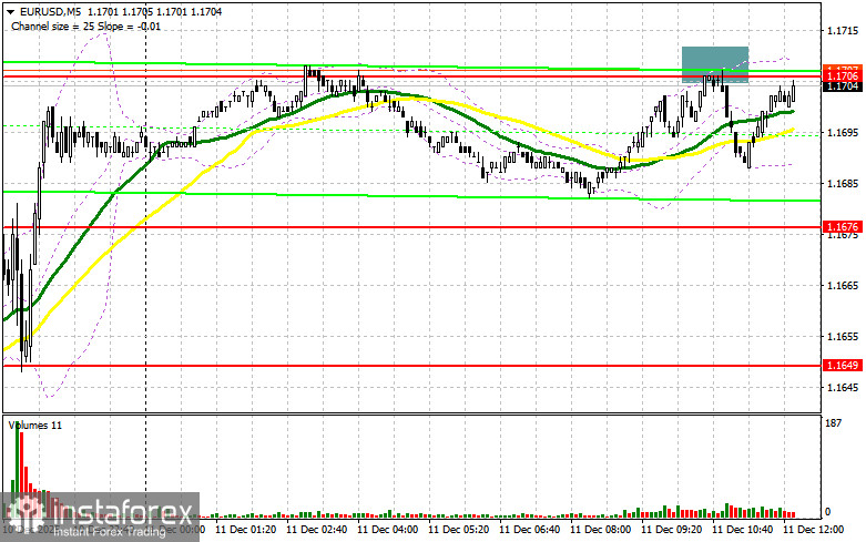 В своем утреннем прогнозе я обращал внимание на уровень 1.1706 и планировал от него принимать решения по входу в рынок. Давайте посмотрим на 5-минутный график и разберемся с тем, что там произошло. Рост и формирование ложного пробоя в районе 1.1706 привели к точке входа на продажу евро, что вылилось в небольшое снижение пары на 15 пунктов. На вторую половину дня техническая картина была пересмотрена.