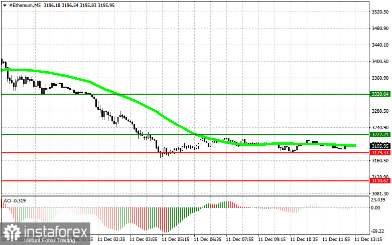 Сценарий №2: покупать эфир можно от нижней границы $3179 при отсутствии рыночной реакции на ее пробой в обратную сторону к уровням $3222 и $3320.