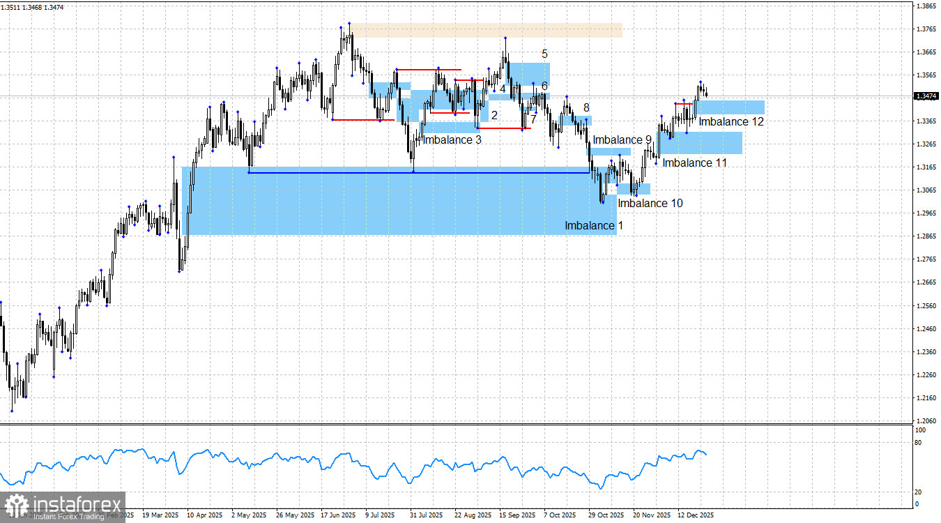 Ожидать возобновление «бычьего» тренда можно было еще из зоны имбаланса 1. На данный момент британец получил реакцию от имбаланса 1, от имбаланса 10 и от имбаланса 11. В качестве цели потенциального роста я рассматриваю уровень 1,3725, но британец может подняться и гораздо выше. Правда, уже в следующем году. При образовании «медвежьих» паттернов торговую стратегию, возможно, придется пересмотреть, но на этой неделе, скорее, будет получен еще один «бычий» сигнал от имбаланса 12.
