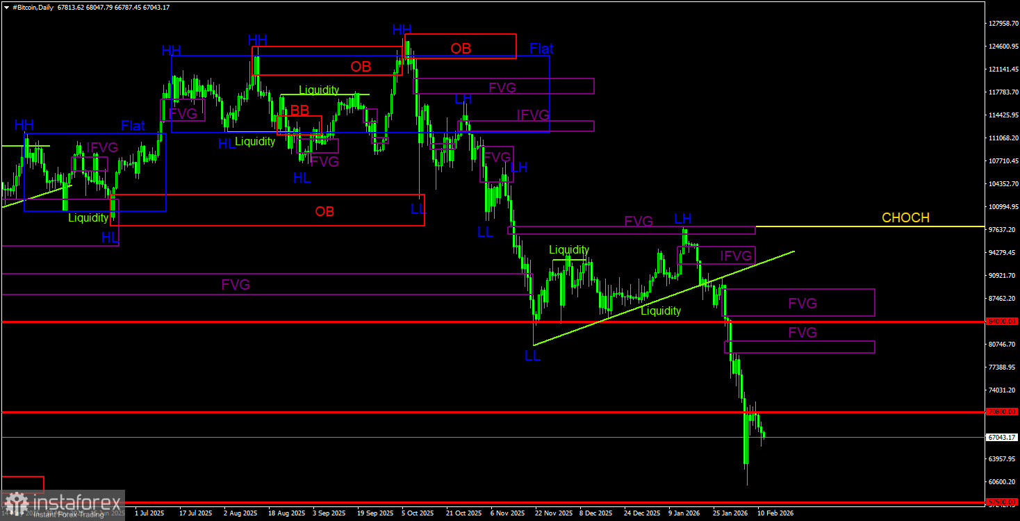 Биткоин продолжает формирование полноценного нисходящего тренда. Мы продолжаем ожидать падения с целью 57 500$(уровень 61,8% по Фибоначчи от трехлетнего восходящего тренда), а признаков разворота тренда в данное время ни одного. Но даже уровень 57 500$ теперь не выглядит, как конечная остановка. Из областей POI на продажу на дневном ТФ можно отметить последний «медвежий» FVG, до которого биткоину еще очень далеко. На 4-часовом ТФ также имеется «медвежий» FVG. Реакция на любой из этих FVG + подтверждение на ТФ младше на два ранга = возможность открытия новых шортов.