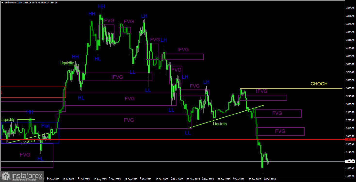 На дневном ТФ продолжается формирование нисходящей тенденции. Ключевым паттерном на продажу выступал и выступает «медвежий» Order-block на недельном ТФ. Как мы и предупреждали, движение, спровоцированное этим сигналом, может быть сильным и длительным. После его формирования эфир уже подешевел на 55% или на 2 500$. В ближайшее время можно было бы ожидать восходящую коррекцию, но единственный «бычий» паттерн на 4-часовом ТФ уже отменен. Вместо него было сформировано сразу два «медвежьих» FVG, которые имеют большую степень вероятности формирования сигналов на продажу, по тренду.