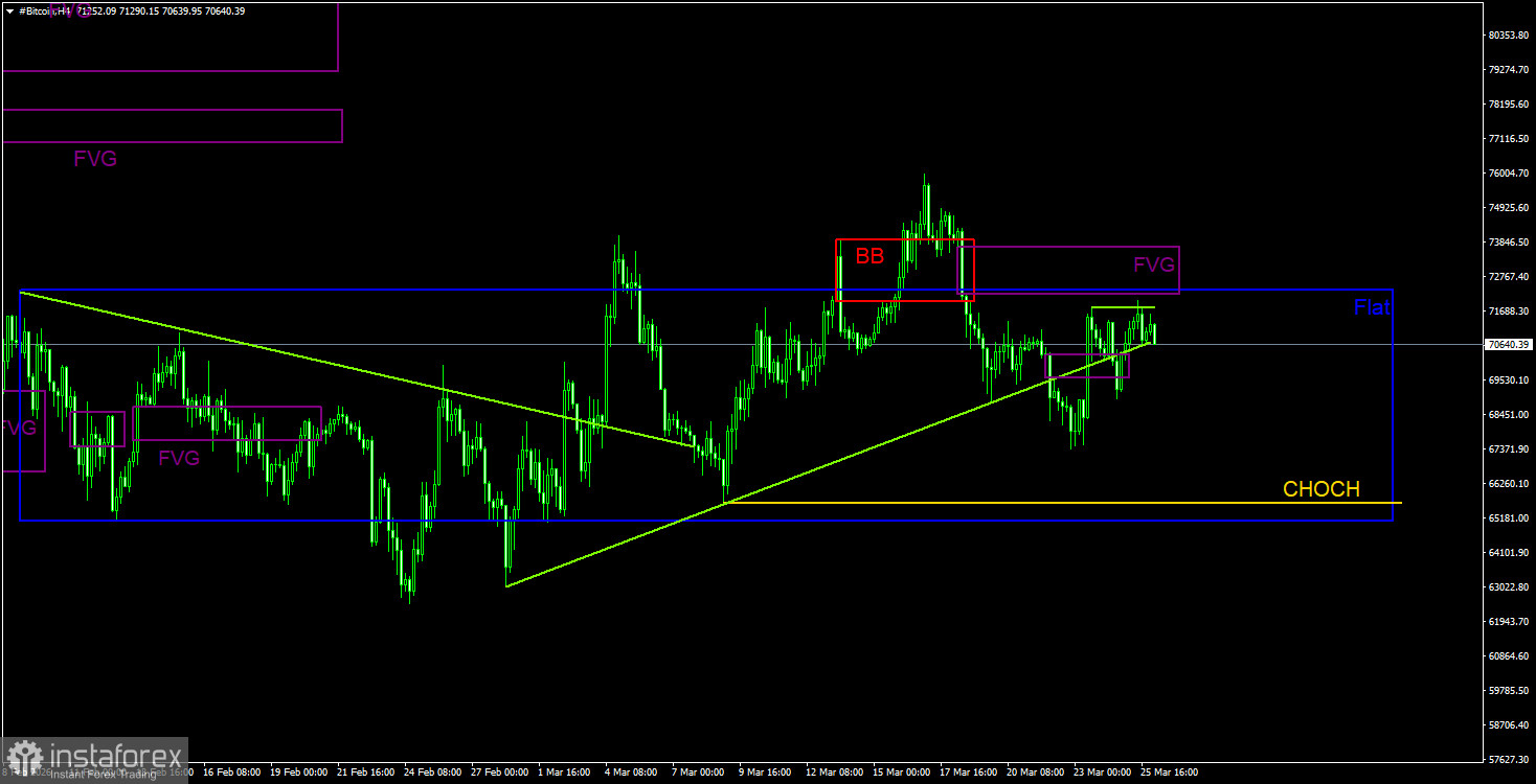 На 4-часовом таймфрейме цена завершила 5-недельный флэт, однако тренд пока не начался. Линия CHOCH, которая является опорой для восходящей коррекции, пролегает на уровне 65 500$. Преодоление этой линии укажет на завершение коррекции, которая длится уже больше месяца. Order-block был импульсно пробит, Breaker-block был импульсно пробит, сигналов сформировано не было, флэт нельзя считать актуальным в данное время, краткосрочную восходящую тенденцию нельзя считать завершенной, понижательное настроение на рынке сохраняется. Последний «медвежий» FVG был отменен после выступления Трампа, сформированный на его базе IFVG тоже не дал ощутимой реакции. FVG около верхней границы бывшего бокового канала также отработан не был.