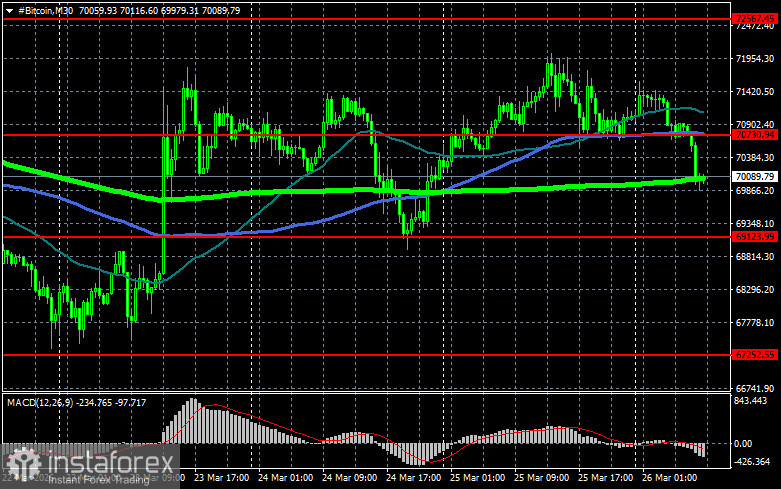 Что касается технической картины Bitcoin, то покупатели сейчас нацелены на возврат уровня $70 700, который открывает прямую дорогу на $72 500, а там уже и рукой подать до уровня 74 600. Самой дальней целью выступит максимум в районе $76 500, преодоление которого будет означать попытки возврата бычьего рынка. В случае падения биткоина покупателей жду на уровне $69 100. Возврат торгового инструмента под эту область может быстро свалить BTC в район $67 200. Самой дальней целью будет область $64 900.