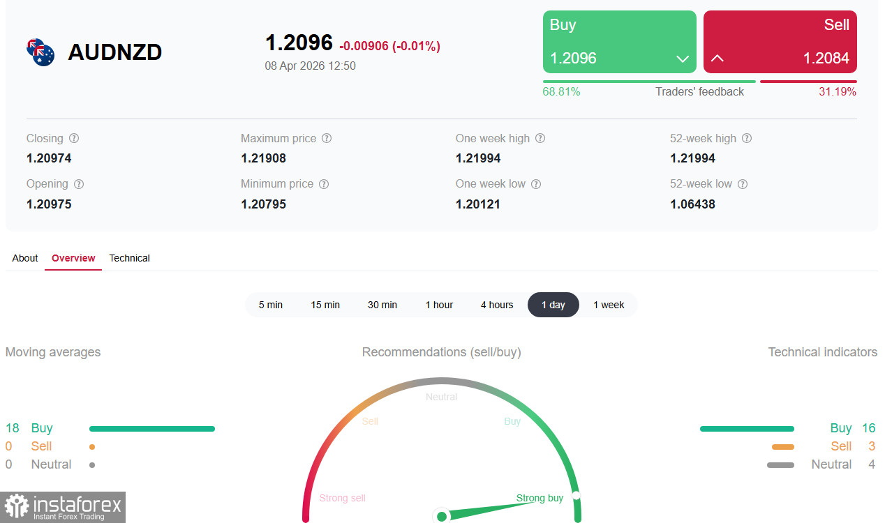 Пара AUD/NZD оказалась на перекрёстке двух мощных сил. С одной стороны, РБНЗ удивил рынок ястребиной риторикой, что даёт новозеландцу поддержку и ограничивает потенциал роста пары. С другой - перемирие между США и Ираном улучшило аппетит к риску, а ожидания дальнейшего повышения ставок РБА (до 4,85%, по прогнозам экономистов) сохраняют привлекательность австралийского доллара.