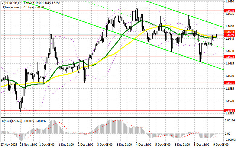 Вчера было образовано несколько точек входа в рынок. Давайте посмотрим на 5-минутный график и разберемся с тем, что там произошло. В своем утреннем прогнозе я обращал внимание на уровень 1.1649 и планировал от него принимать решения по входу в рынок. Снижение и формирование ложного пробоя в районе 1.1649 привели к точке входа на покупку евро, но до крупного роста пары дело так и не дошло. Во второй половине дня активные действия быков уже в районе следующей поддержки 1.1623 привел ко входу в длинные позиции, что вылилось в рост пары на 20 пунктов.