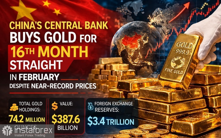 В феврале Народный банк Китая продолжил наращивать золотые резервы - 16-й месяц подряд, несмотря на геополитическую напряженность, державшую цену золота у январских рекордов. По данным Государственного управления валютного контроля (SAFE), в прошлом месяце добавлено 30 000 тройских унций, доведя общий запас до 74,2 миллиона унций (~2308 тонн), на сумму около 387,6 миллиарда долларов. С ноября 2024 года прирост превысил 1,4 миллиона унций.