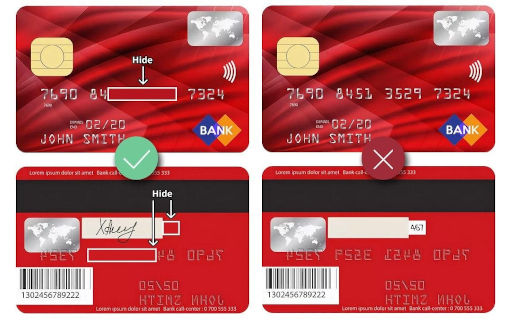 Demi keselamatan anda, kami meminta anda menyembunyikan sebahagian daripada nombor kad di bahagian depan dan belakang kad, hanya tinggal 6 digit pertama dan 4 digit terakhir. Anda juga perlu menyembunyikan kod CVC2 / CVV2 di bahagian belakang.