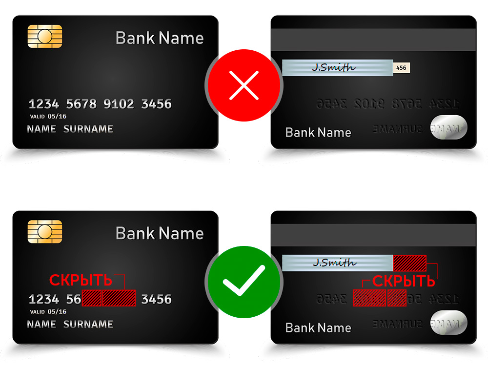 Кроме того, для вашей финансовой безопасности мы просим вас скрывать часть номера карты на лицевой и оборотной стороне, оставляя видимыми лишь первые 6 и последние 4 цифры. Обратите внимание, что код CVС2/CVV2 на оборотной стороне карты тоже необходимо скрыть.
