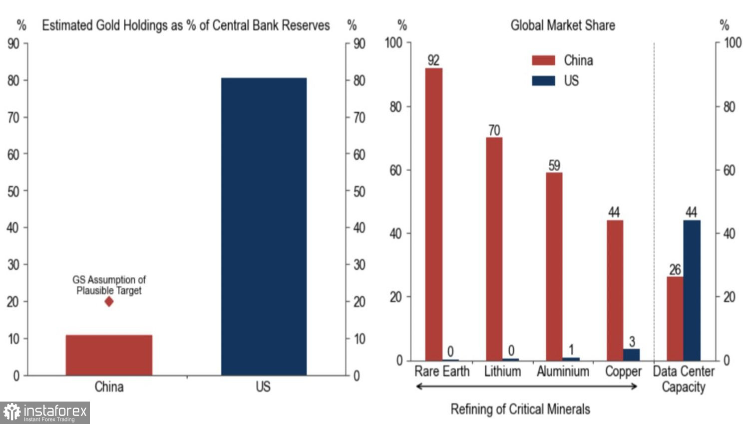 Важным драйвером поддержки «бычьего» тренда по XAU/USD стал неуемный аппетит центробанков. По оценкам Goldman Sachs, они ежемесячно будут приобретать слитки на 70 т. Эта цифра близка к средним 66 т за последний год и в четыре раза больше имевших место до 2022 покупок. Особую активность продолжат демонстрировать регуляторы развивающихся стран. Тот факт, что доля золота в резервах Китая существенно ниже, чем в США или других развивающих странах, подталкивает Пекин к увеличению спроса.