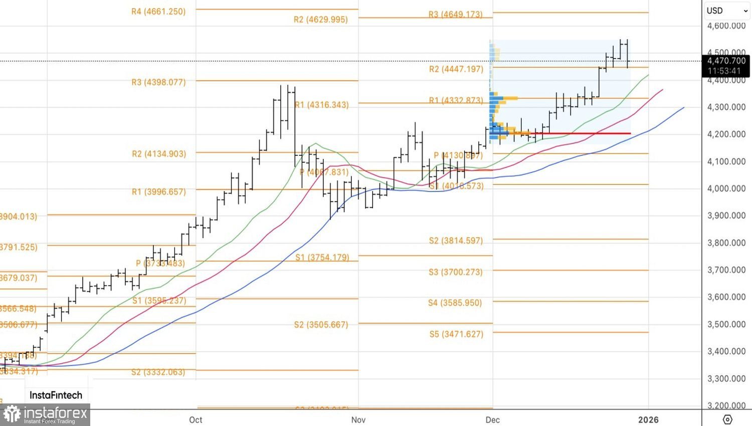 Технически на дневном графике золота имеет место отступление от рекордных максимумов. Поддержка в виде пивот-уровня расположена вблизи отметки $4447 за унцию. Ее уверенный прорыв усилит риски отката и даст основание для формирования краткосрочных шортов. Напротив, отбой – повод нарастить ранее сформированные лонги.