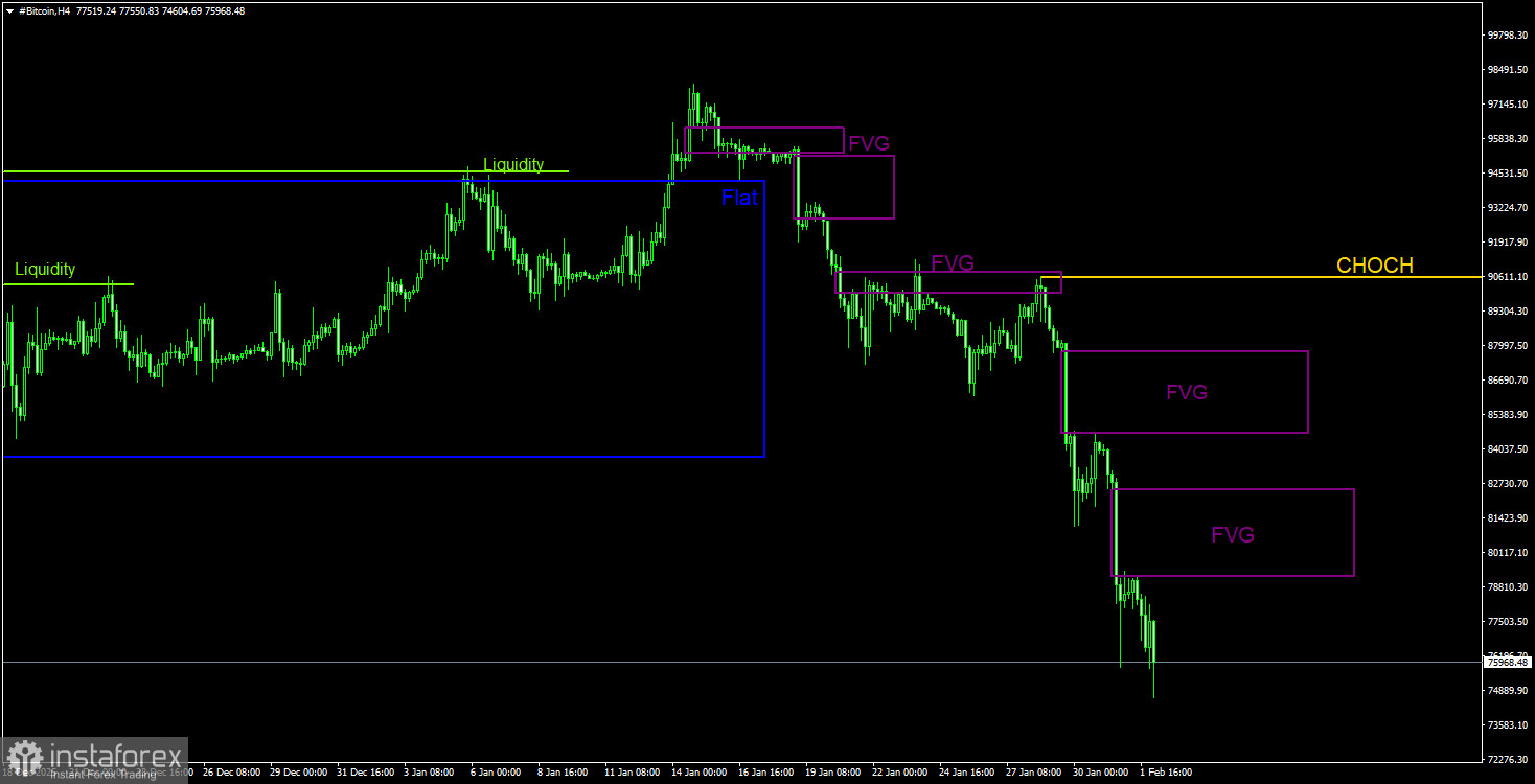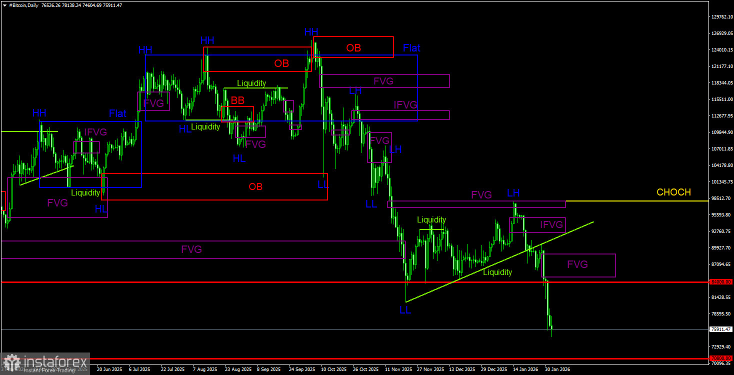 На дневном ТФ биткоин продолжает формирование нисходящей тенденции. Структура тренда идентифицируется, как нисходящая, а линия CHOCH в данное время проходит на уровне 97 900$. Только выше этого уровня можно будет считать, что нисходящий тренд завершен. В 2026 году биткоин может падать хоть до 60 000$, откуда начинал свое последнее восхождение. Прошел только один месяц нового года, а биткоин уже опускался до 75 000$. Цена получила красноречивую реакцию на «медвежий» FVG, торговый сигнал был сформирован. Целью нового витка нисходящего движения выступает уровень 70 800$ – 50,0% по Фибоначчи. Из новых областей POI на продажу мы выделяем «медвежий» IFVG и «медвежий» FVG. В будущем от этих паттернов можно будет открывать новые шорты.