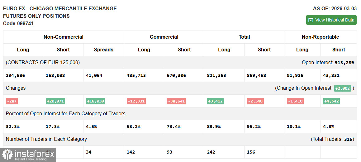 В COT-отчете (Commitment of Traders) за 3 марта наблюдалось сокращение длинных позиций и резкий рост коротких. Учитывая войну США и Израиля с Ираном, нет ничего удивительно, что в этом отчете отмечен резкий рост коротких позиций по евро. Однако ситуация на Ближнем востоке так стремительно меняется, что в настоящее время на эти цифры лучше не обращать внимание. В COT-отчете указано, что длинные некоммерческие позиции снизились на 287 до уровня 294 586, в то время как короткие некоммерческие позиции выросли на 20 071 до уровня 158 088. В результате спрэд между длинными и короткими позициями вырос на 16 030.