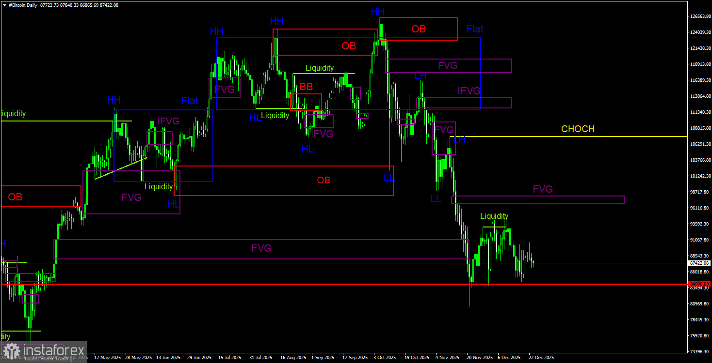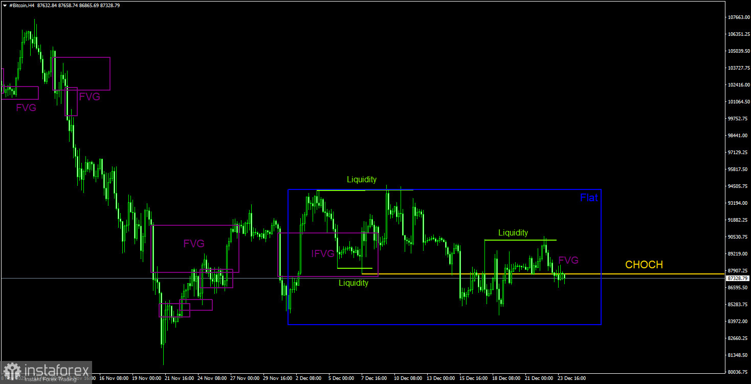 На 4-часовом таймфрейме техническая картина также однозначно указывает на нисходящий тренд, а цена все еще находится в обновленном боковом канале. Линия CHOCH(слом тренда), которая проходила на уровне 87 600$, преодолена, а значит краткосрочная восходящая тенденция сломлена. Однако внутри флэта локальные тенденции не имеют значения. В ближайшее время трейдеры могут вести торговлю только от границ бокового канала. При чем, сигналы на продажу, с нашей точки зрения, гораздо более привлекательные, чем сигналы на покупку. Формально два сигнала на продажу уже было сформирован. А значит рассчитывать на падение к нижней линии флэта по-прежнему можно. Последнее снятие ликвидности на продажу также указывает на продолжение падения.