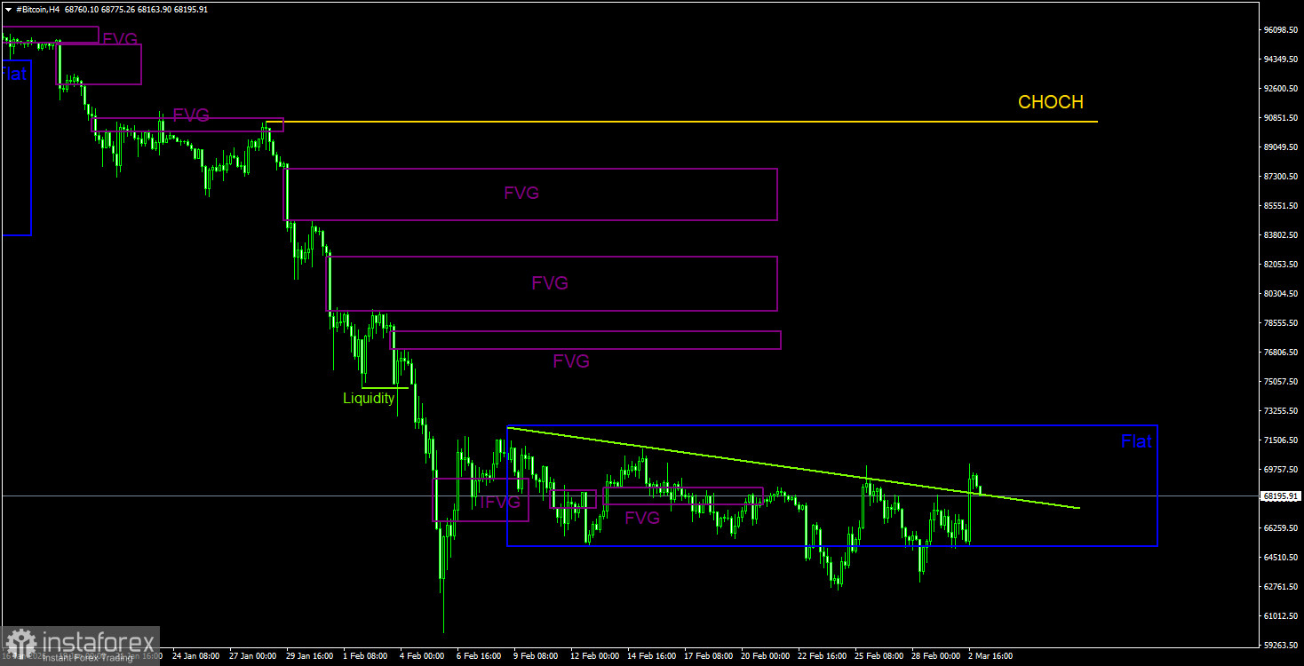Биткоин продолжает формирование полноценного нисходящего тренда. Мы продолжаем ожидать падения с целью 57 500$(уровень 61,8% по Фибоначчи от трехлетнего восходящего тренда), а признаков разворота тренда в данное время ни одного. Но даже уровень 57 500$ теперь не выглядит, как конечная остановка. Из областей POI в данное время можно отметить только ближайший «медвежий» FVG на дневном ТФ, который располагается достаточно далеко от цены. Также мы бы обращали внимание на девиации верхней границы бокового канала на 4-часовом ТФ, так как тренд все-таки остается нисходящим.